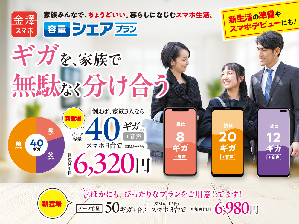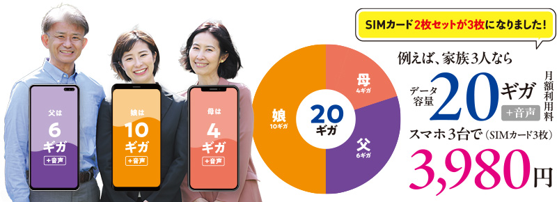 例えば、お父さんが使い切れないデータ通信容量を、娘さんのスマホで分けあったり。いつも余ってたギガを有効活用できます!